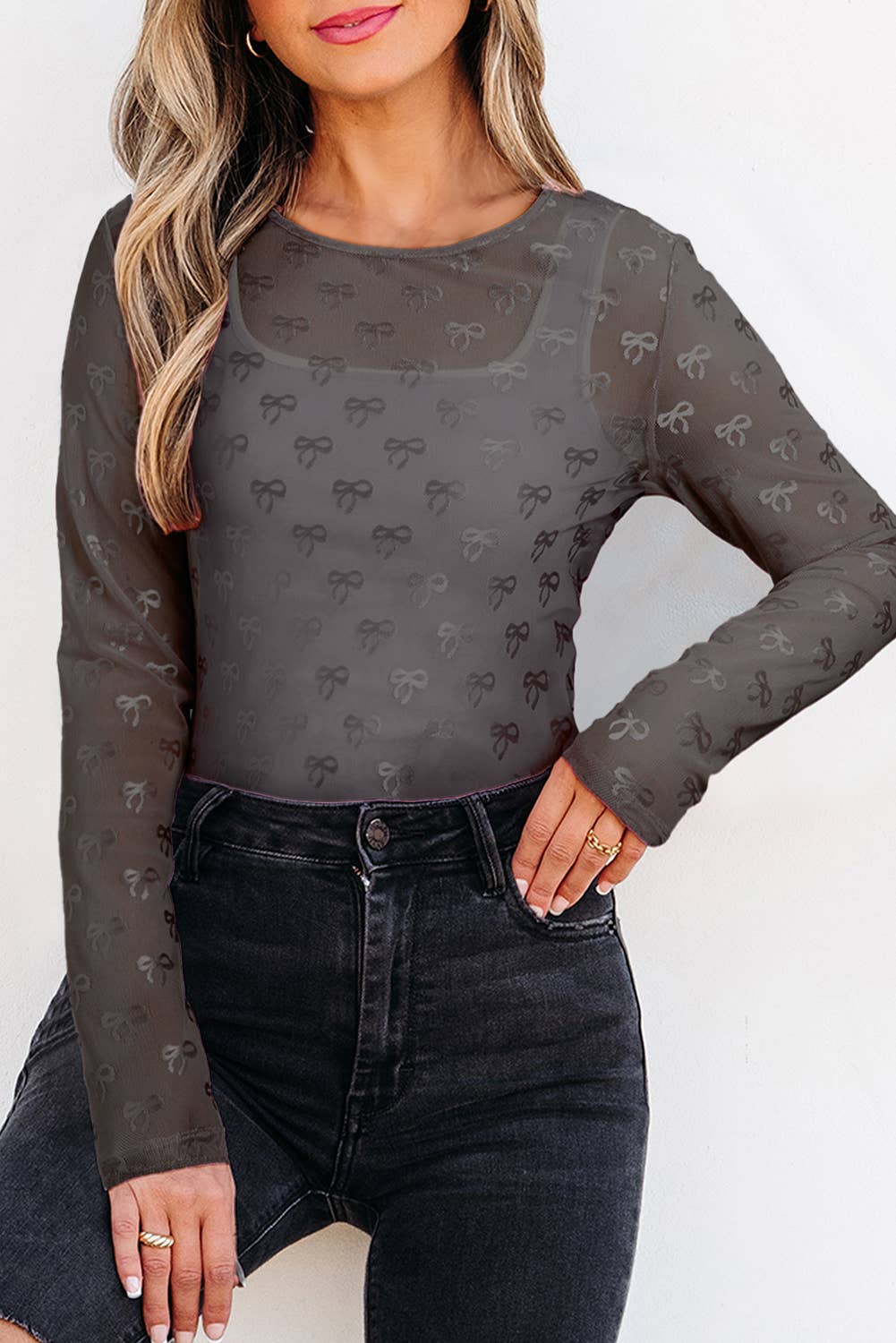 Bow Pattern Long Sleeve Slim Fit Mesh Blouse